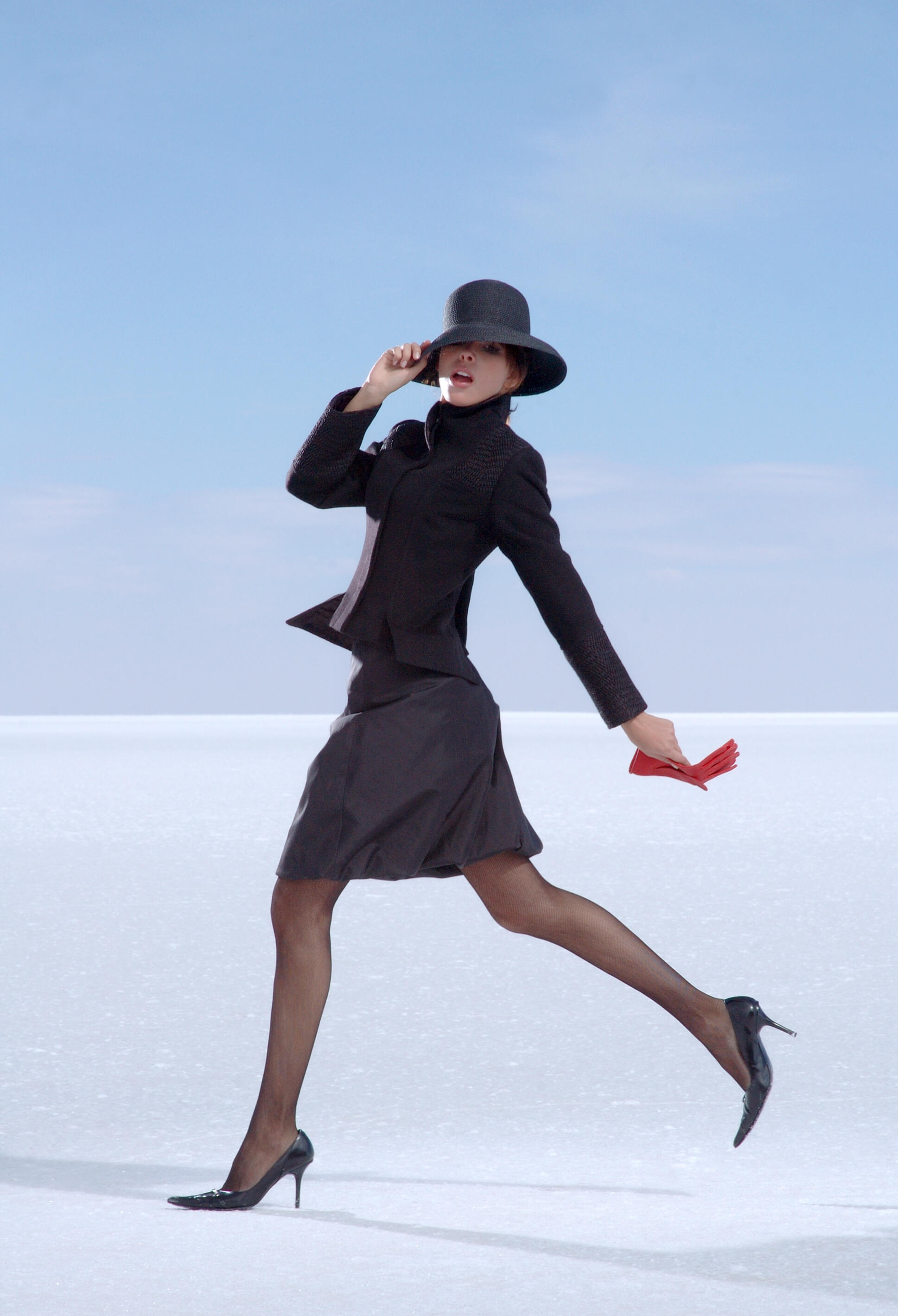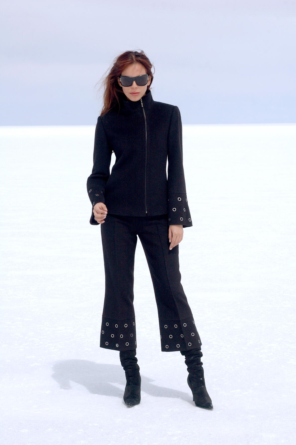 Las siluetas son limpias y expansivas. Líneas precisas, volúmenes abiertos, capas que flotan como reflejos sobre la sal y el agua. El cuerpo se mueve con libertad, casi suspendido, en una coreografía silenciosa que responde al ritmo del entorno.
