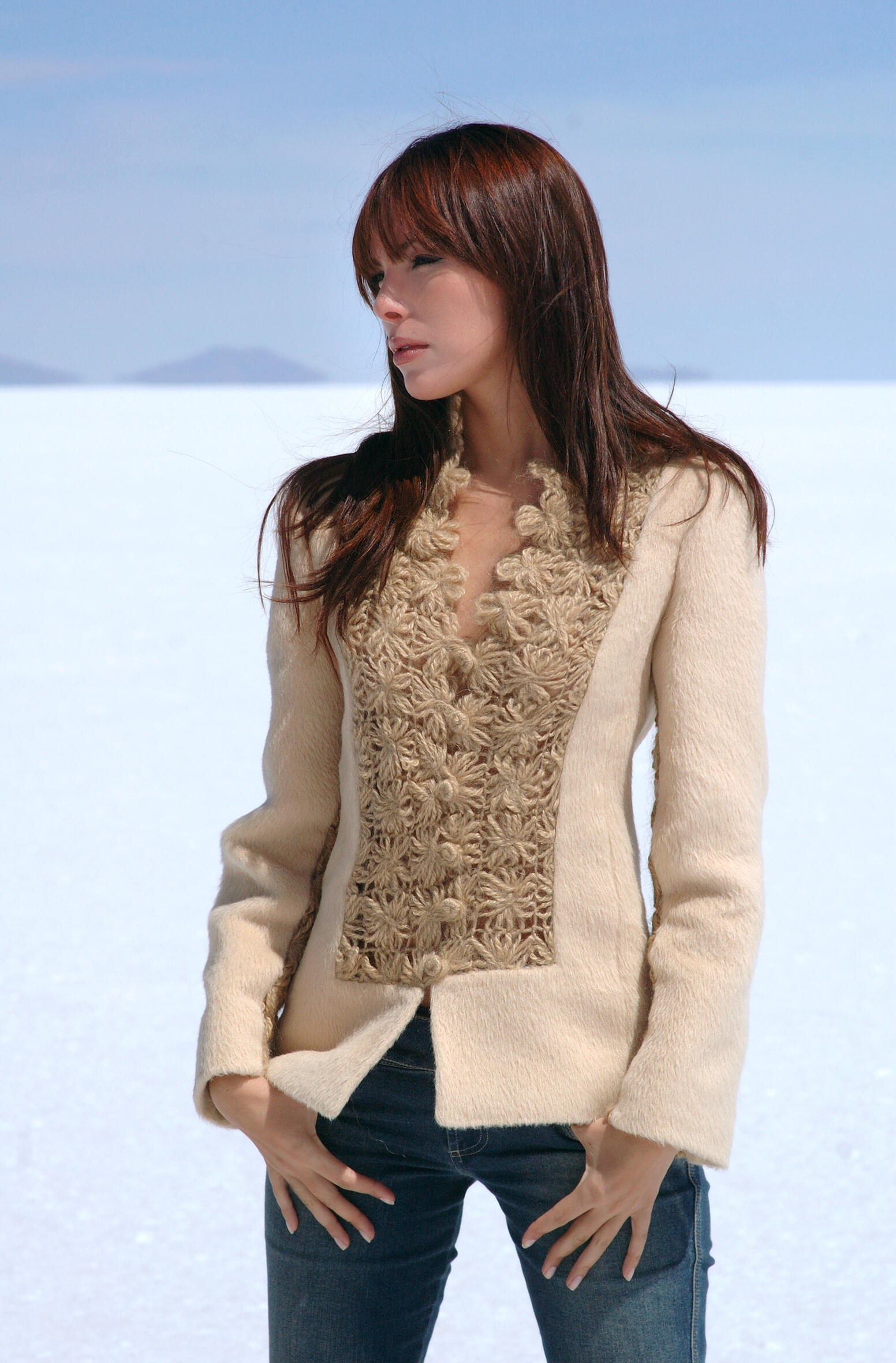 Esta coleccón nace de la luz absoluta. De ese instante en el Salar de Uyuni donde el blanco deja de ser ausencia y se vuelve presencia total. Se inspira en la vastedad del salar como territorio de contemplación y espejo infinito. Las prendas que dialogan con el horizonte, que reflejan la luz, que se funden con el espacio sin desaparecer.